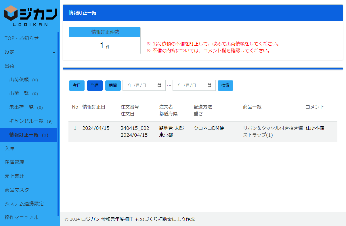 • ・情報訂正に移動された注文は、ロジカンから出荷できません。不備情報を確認し、訂正した注文を出荷依頼から再度登録してください。