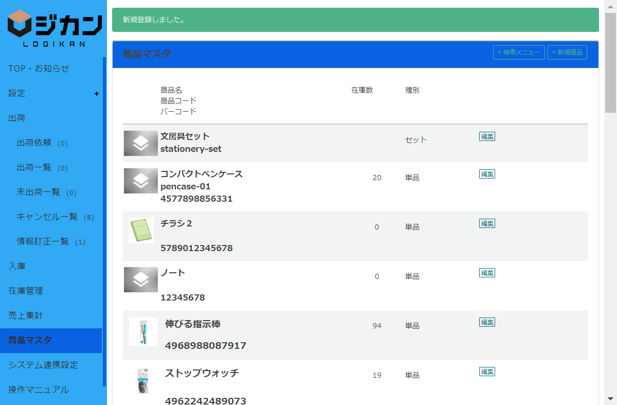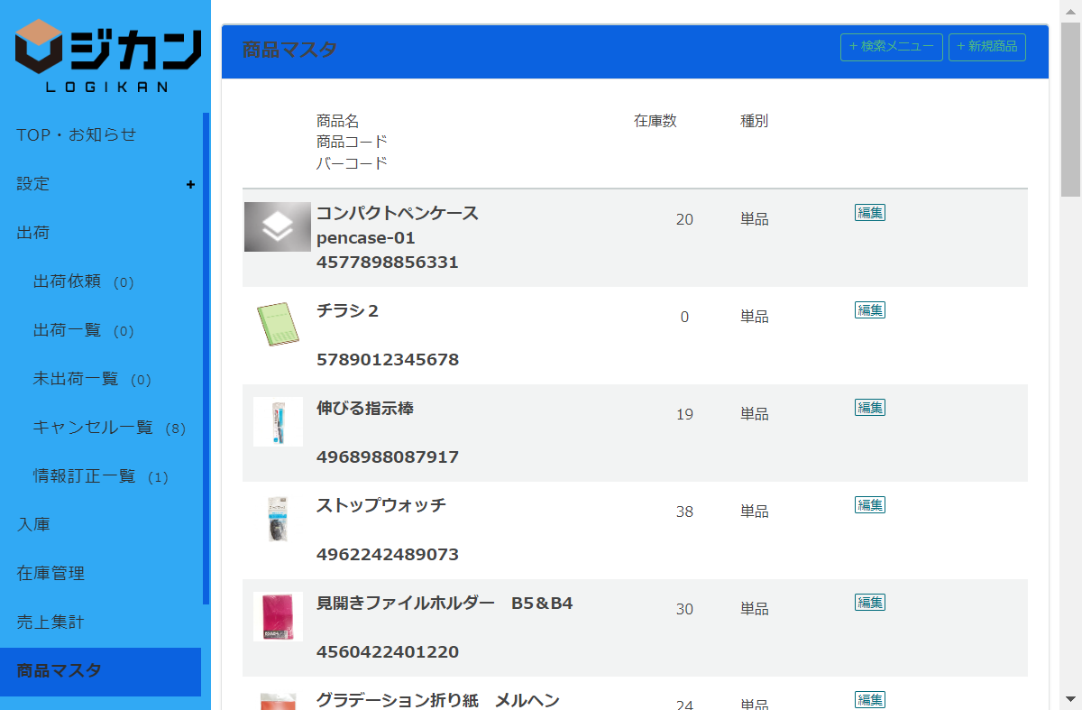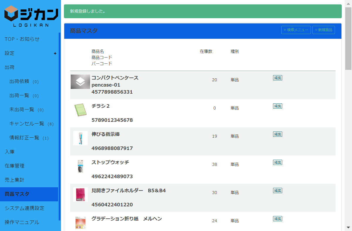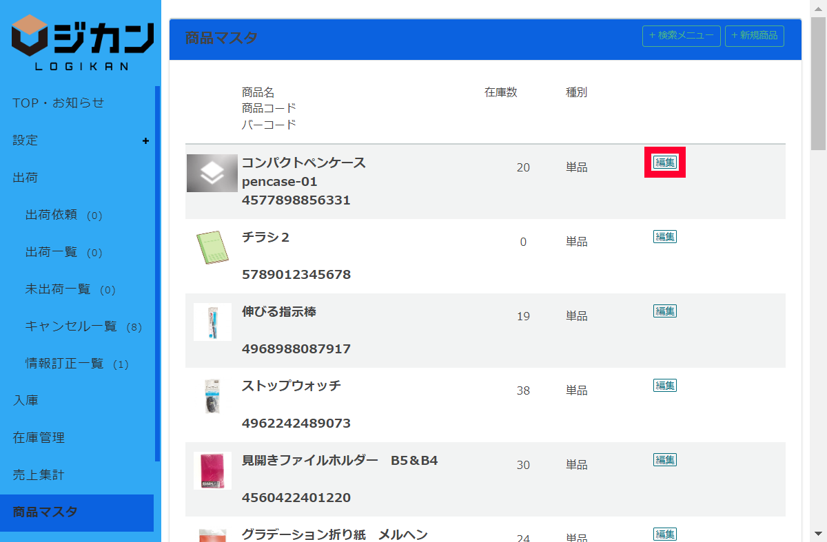 「商品マスタ」ページでは、ロジカンで出荷する商品を登録する方法を説明します。