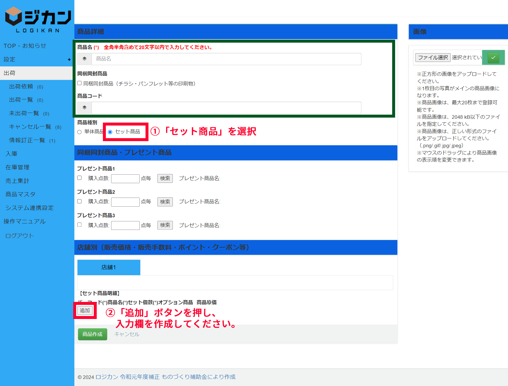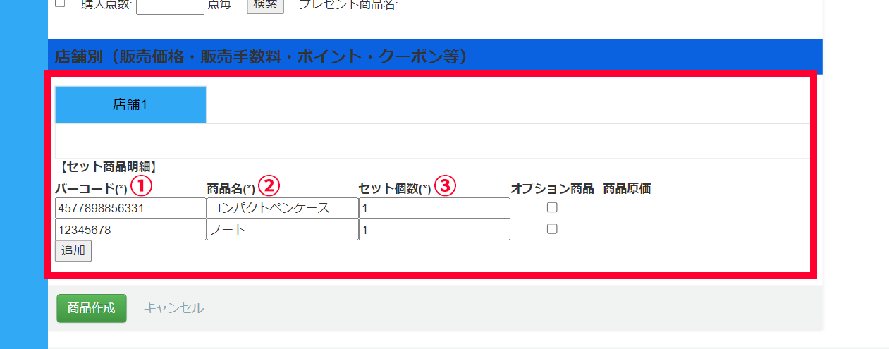 赤枠内セット商品の入力欄を作成後、商品情報を入力します。