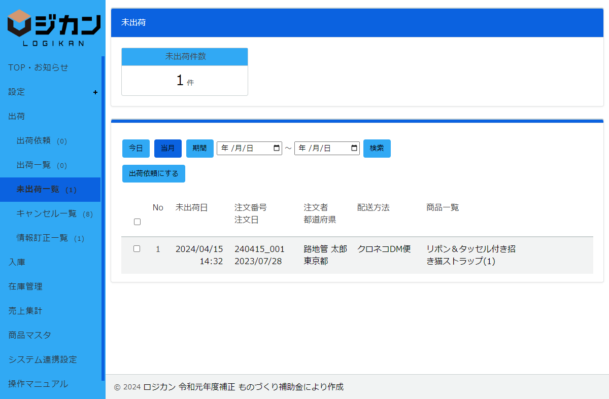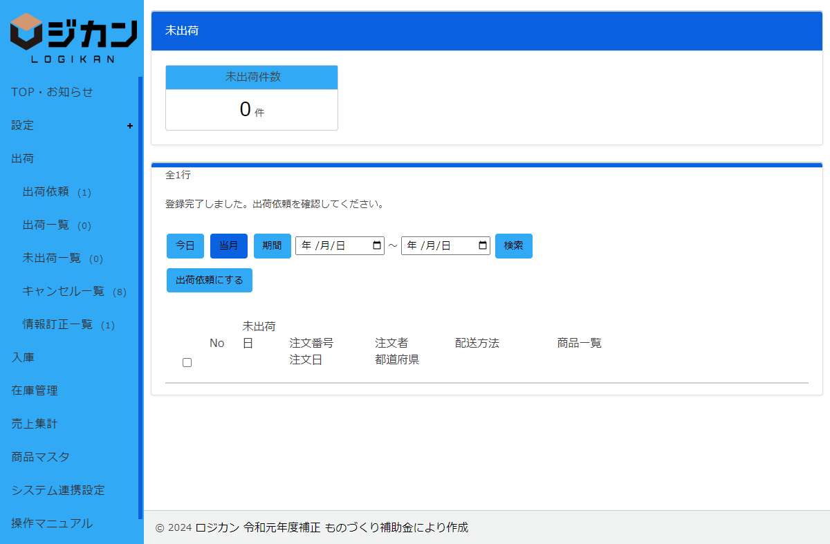 「未出荷一覧」の初期表示は、当月の件数が表示されます。