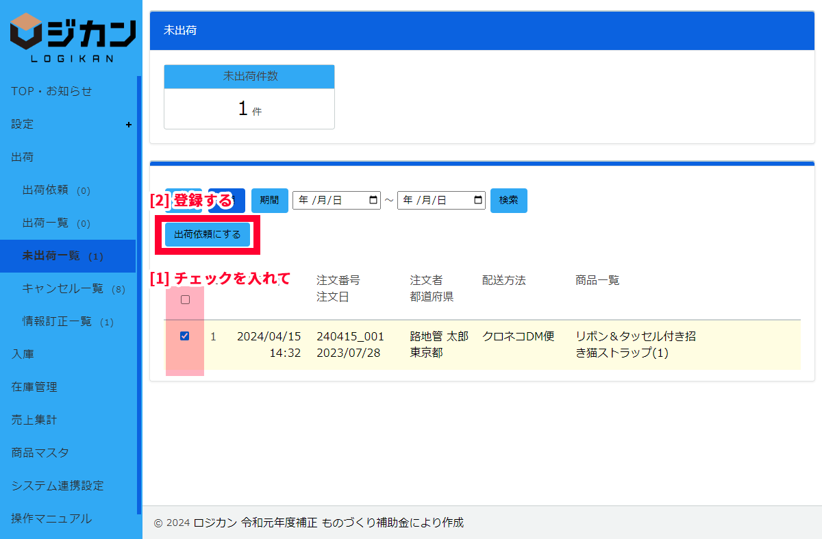 出荷依頼に登録する未出荷注文のチェックボックスをチェックして、「出荷依頼にする」をクリックします。