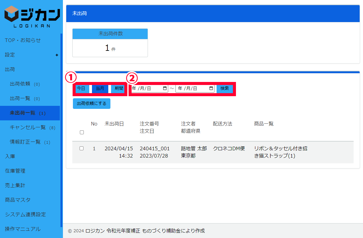 「未出荷件数」には、検索された期間の未出荷注文件数が表示されます。