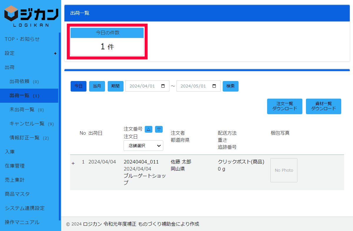 「出荷件数」の初期表示には、本日の出荷済み注文件数が表示されます。