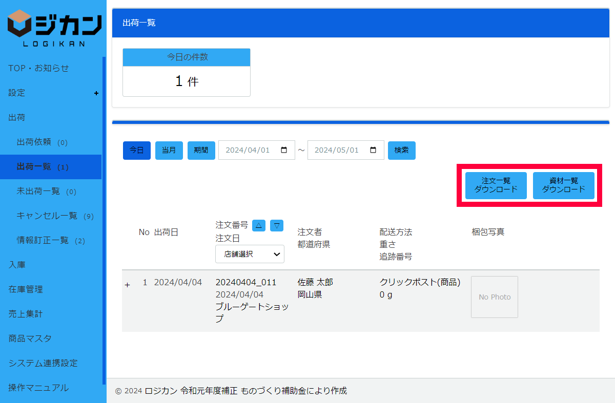 「使用資材一覧ダウンロード」ボタンでは、出荷に使用した資材のデータをCSVファイルでダウンロードすることができます。