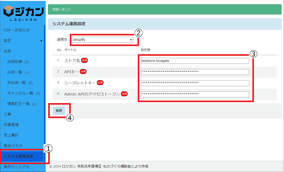 ※ 入力する内容は、「●Shopifyショップ連携設定項目の確認」を参照ください。