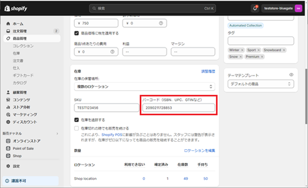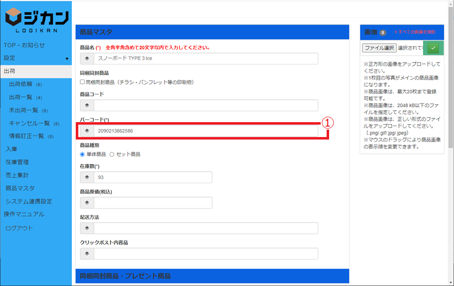 ① 商品マスタの[バーコード]に、Shopifyの商品に設定している[バーコード]を入力してください。