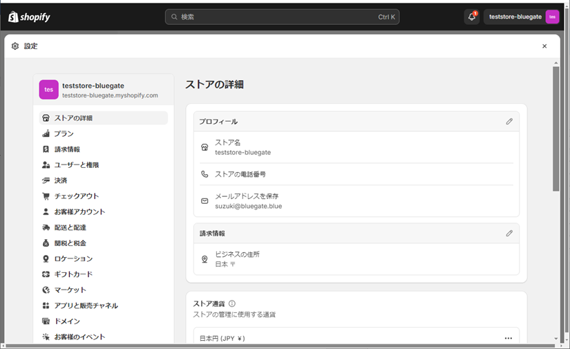 ① Shopify管理画面のサイドメニューから[ストアの詳細]にある[ストア名]を確認してください。