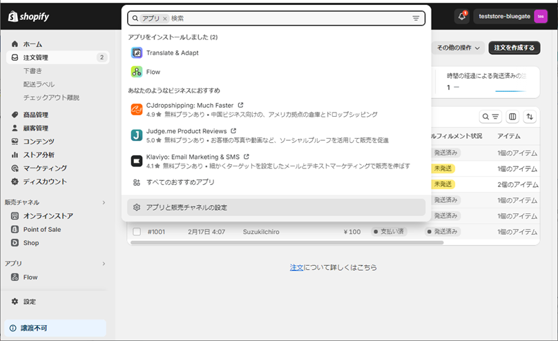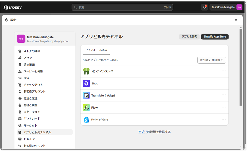 ① Shopify管理画面のサイドメニューから[アプリ]>[アプリと販売チャネルの設定]をクリックします。