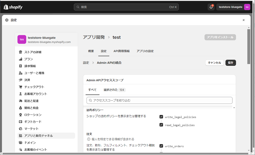 ② Admin APIアクセススコープのチェックボックスで、【必要なアクセススコープ】をチェックをして、[保存]ボタンをクリックします。