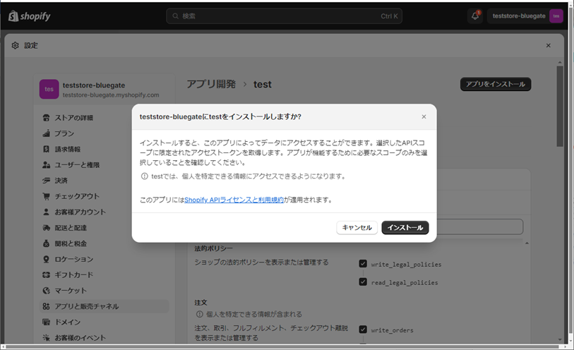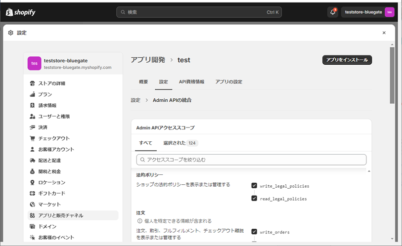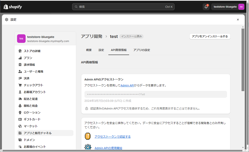 ① 作成したアプリ名>API資格情報>アクセストークン>[Admin APIスコープを設定する]をクリックします。